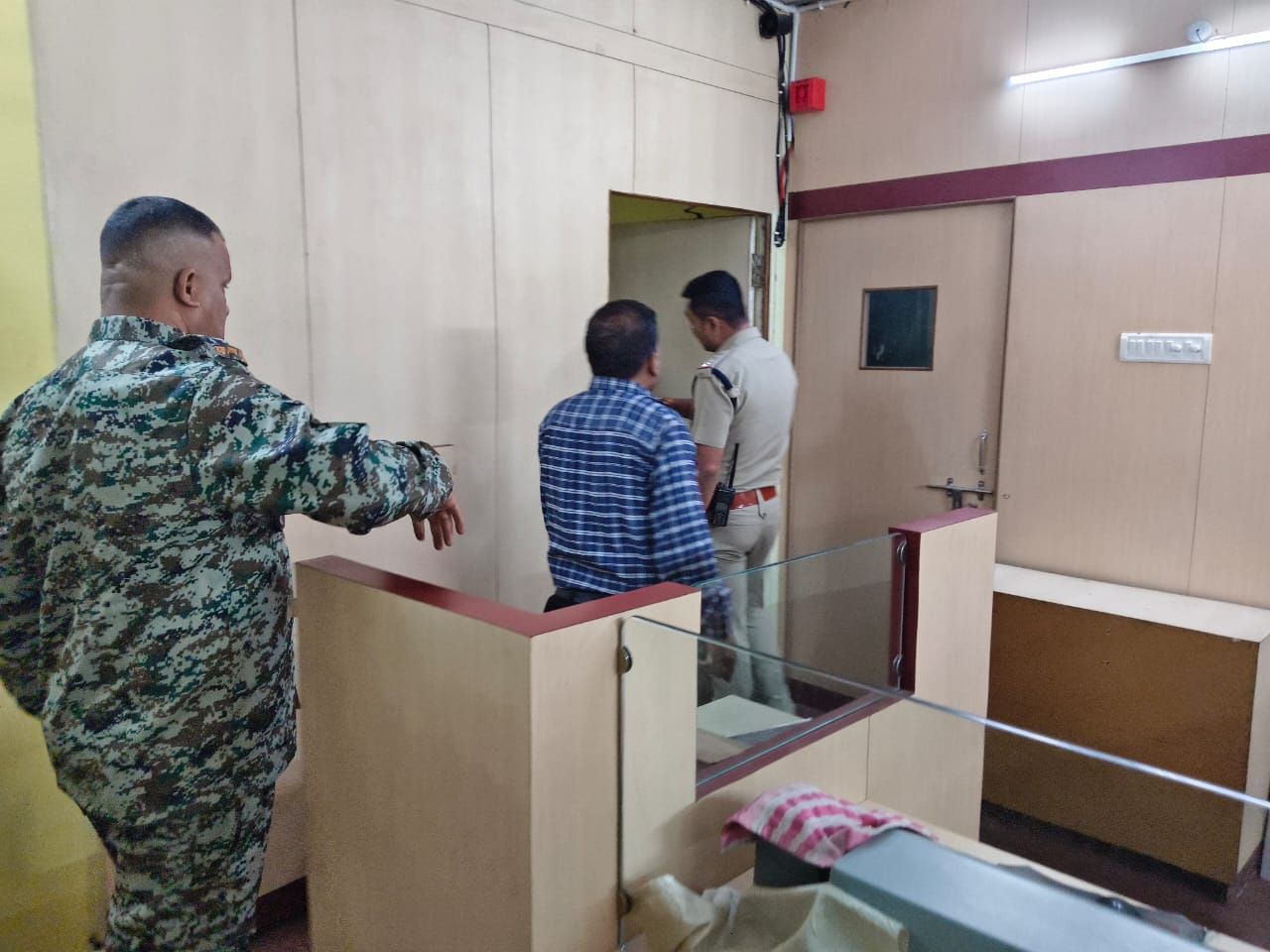 दोनों आरक्षक तत्काल बैंक की ओर पहुंचे, पुलिसकर्मियों को आता देख बाहर खड़ी गाड़ी को चालक ने स्टार्ट किया और तभी बैंक की ओर से एक व्यक्ति भागते हुए आकर वाहन में बैठा और तेजी से शहर की ओर फरार हो गया। स्थिति को गंभीर मानते हुए आरक्षकों ने तत्काल थाना प्रभारी जूटमिल निरीक्षक अभिनवकांत एवं पेट्रोलिंग में लगे प्रधान आरक्षक रामनाथ बनर्जी को सूचना दी। सूचना मिलते ही टीआई जूटमिल अभिनवकांत सिंह, प्रधान आरक्षक रामनाथ बनर्जी एवं थाना स्टाफ रायफल के साथ घेराबंदी के लिए मौके पर पहुंचे।