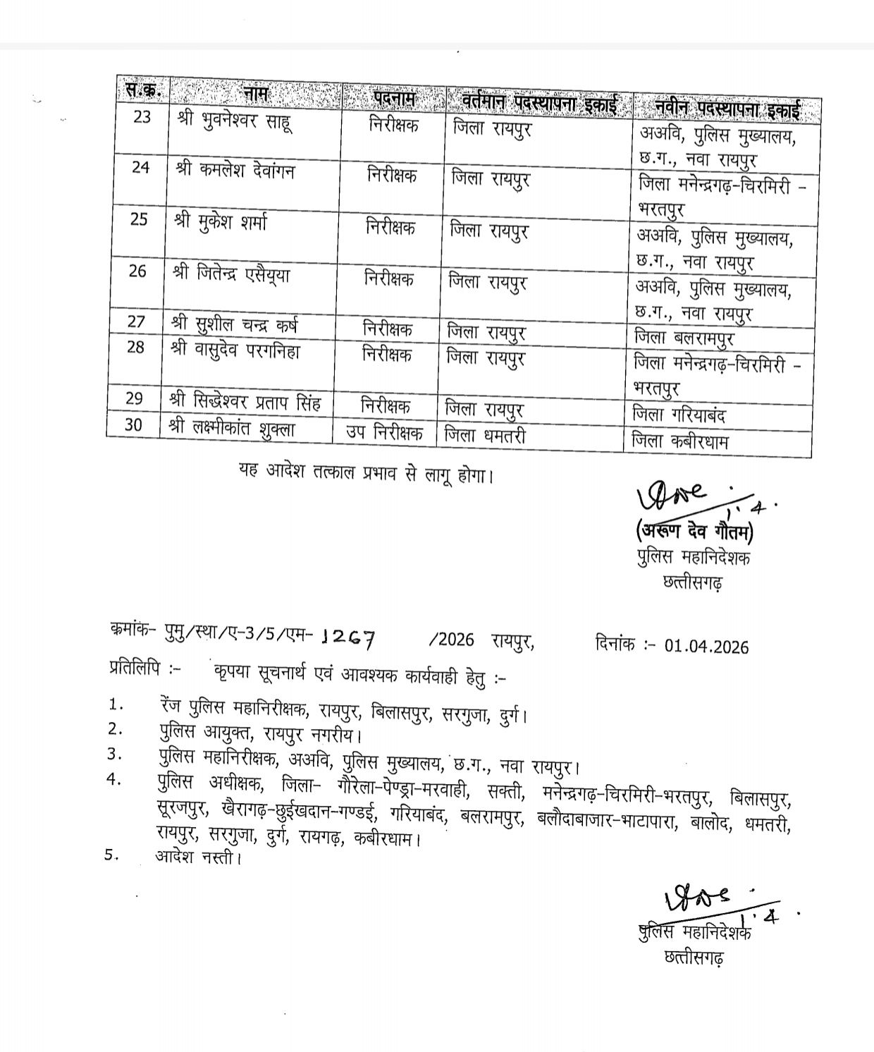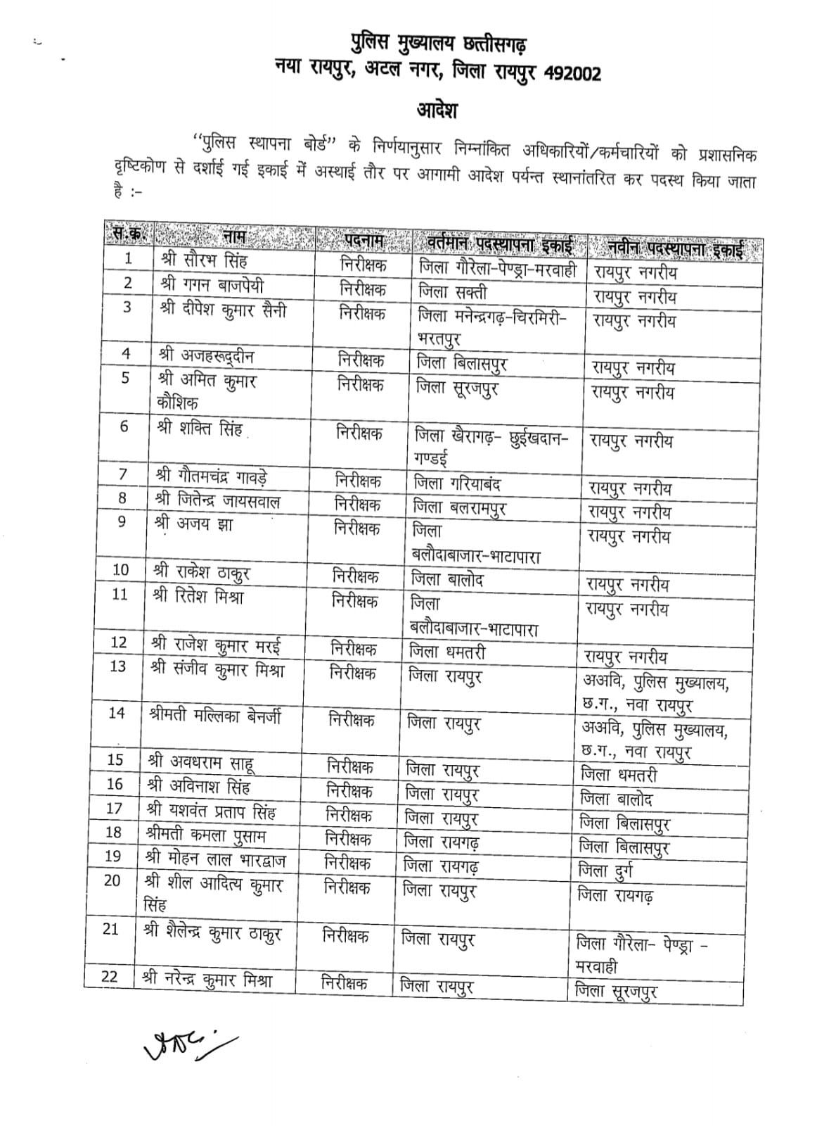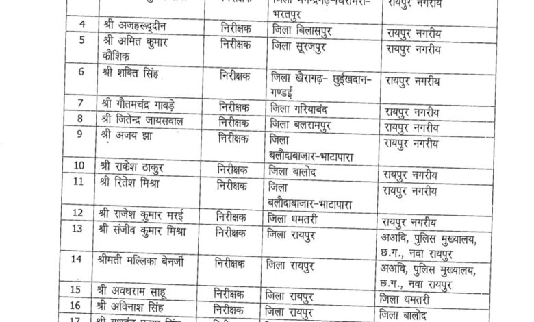 कमला पुसाम एवं मोहन भारद्वाज का हुआ तबादला बिलासपुर एवं दुर्ग पुलिस विभाग में बड़ा फेर बदल